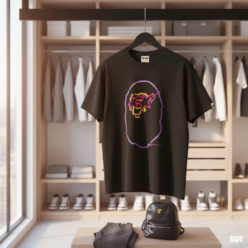 A Bathing Ape black cotton T-shirt featuring purple outline Ape Head with yellow lightning and pink star design, soft breathable fabric, sleeve logo tag, unisex street fashion essential.