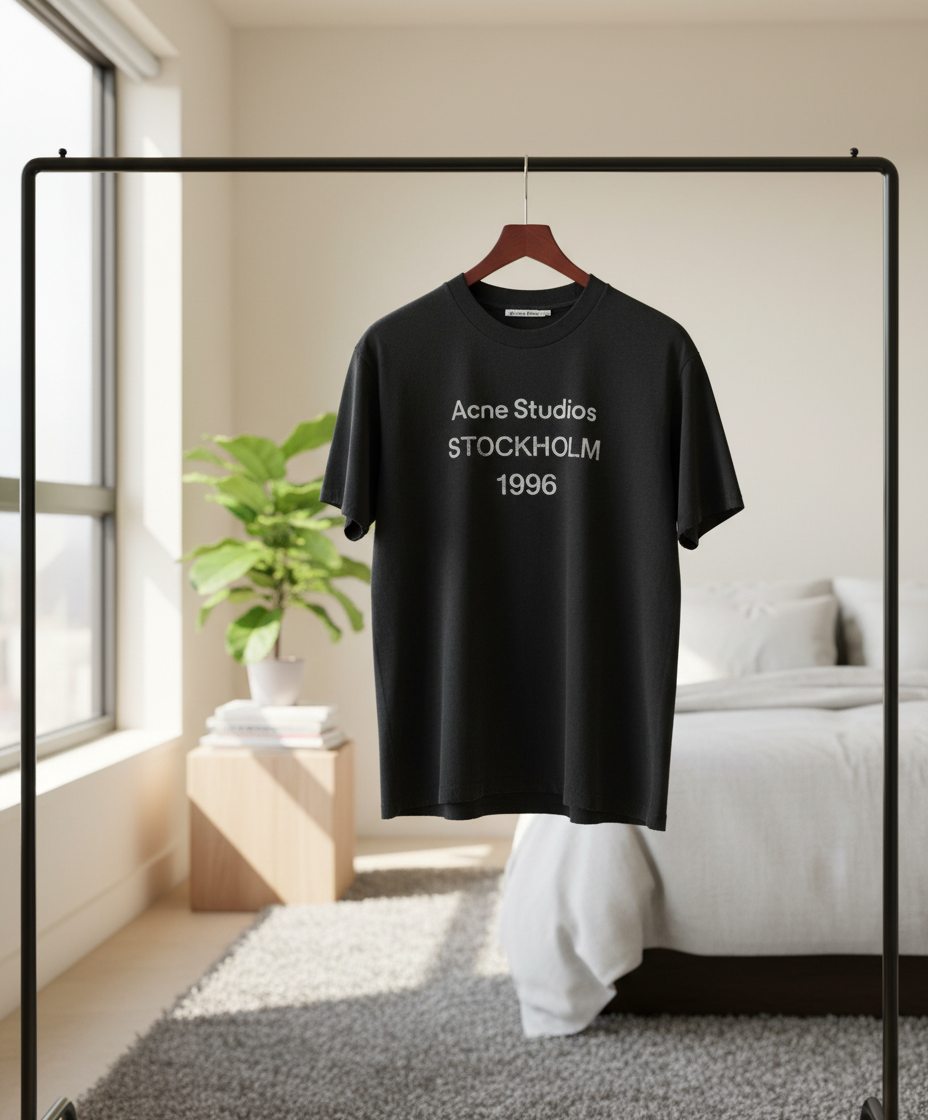 Acne Studios Basics Print Black T-Shirt, soft breathable cotton, white “STOCKHOLM 1996” logo on chest, minimalist Nordic style, unisex fit, perfect for casual everyday wear.