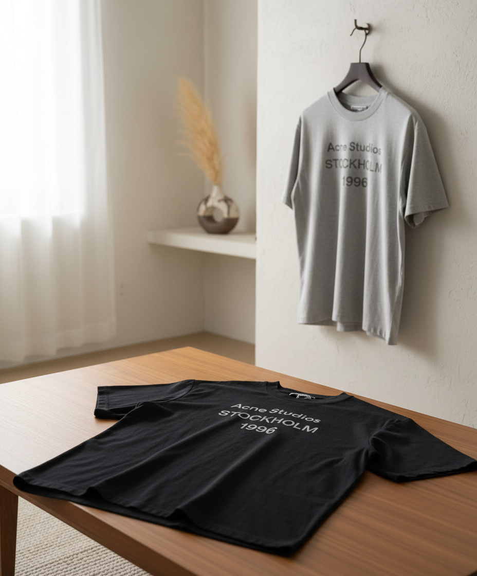 Acne Studios 1996 Collection Black T-Shirt, soft cotton fabric with Stockholm print, Nordic minimalist style, unisex design, perfect for daily casual wear, effortlessly trendy and versatile.
