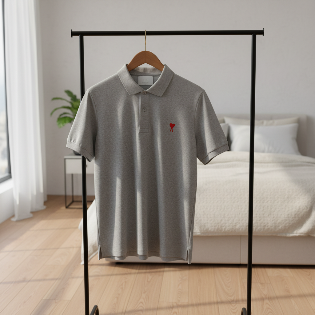 Ami Paris Grey Cotton Polo Shirt with classic collar and red heart logo on chest, soft breathable fabric, timeless unisex style, perfect for everyday casual wear.
