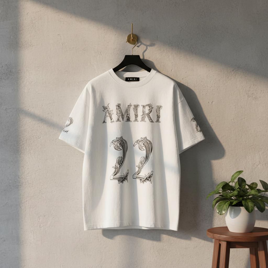 AMIRI White Street Style Cotton T-Shirt, breathable and comfortable, featuring bold AMIRI lettering and number 22 graphic on the back, unisex design for a modern, edgy look.