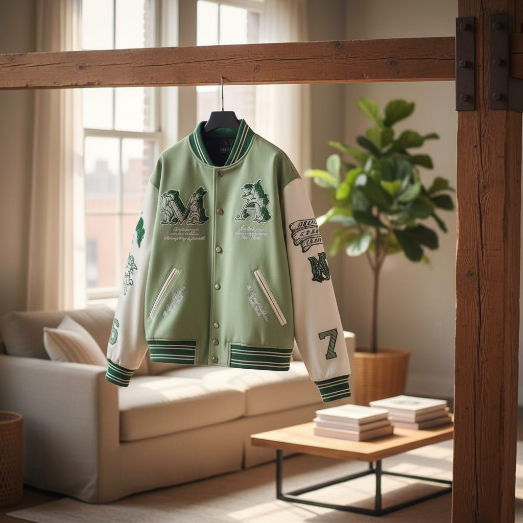 AMIRI Light Green and White Patchwork Baseball Jacket, premium fabric, angel and letter embroidery, ribbed collar and cuffs, unisex streetwear style for casual warmth and daily comfort.