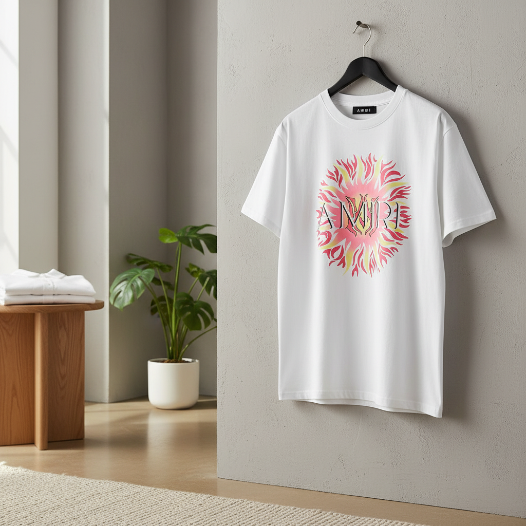 AMIRI White Cotton T-Shirt features soft breathable fabric, pink-yellow gradient flame motif with logo print on back, unisex streetwear style perfect for everyday casual outfits.