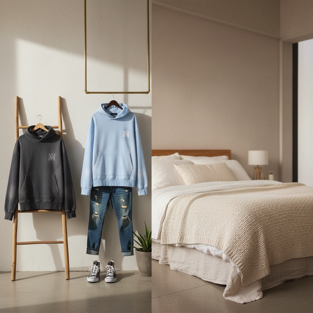 AMIRI Hoodie for Men and Women, available in dark gray, light blue, and white. Soft breathable cotton, front logo, bold back lettering, drawstring hood, and kangaroo pocket for streetwear style.