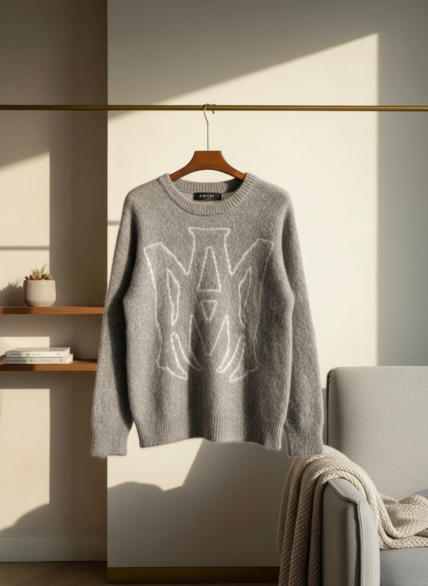 Amiri Grey Crewneck Sweater, crafted from soft fuzzy fabric, features a bold white M logo on chest, unisex streetwear style, warm and comfy for a trendy modern look.