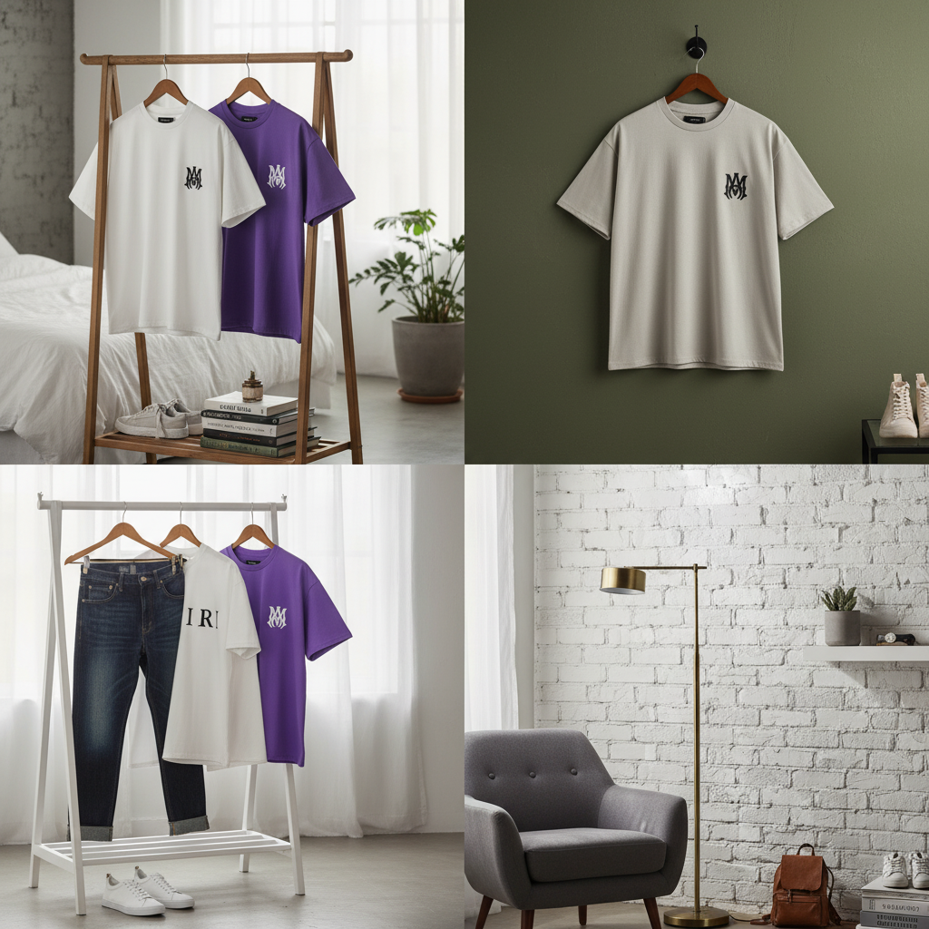 AMIRI multicolor street style cotton T-shirt, breathable and soft. Features iconic MM emblem on front, bold brand logo on back. Unisex design for casual wear, showcasing modern fashion attitude.