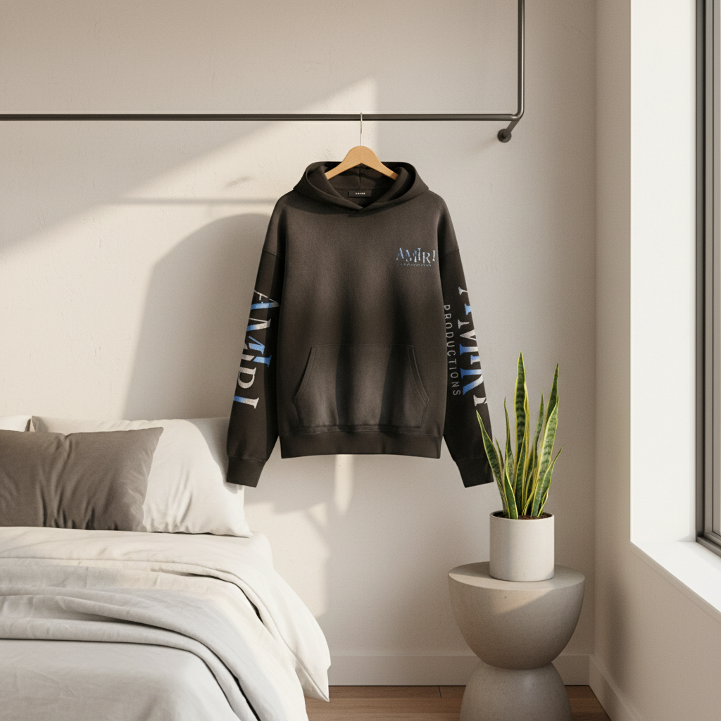 Amiri Gradient Black Hoodie crafted from soft breathable cotton, features logo front, mask and rose graphic back, letter print sleeves, unisex streetwear style for daily comfort and bold fashion.