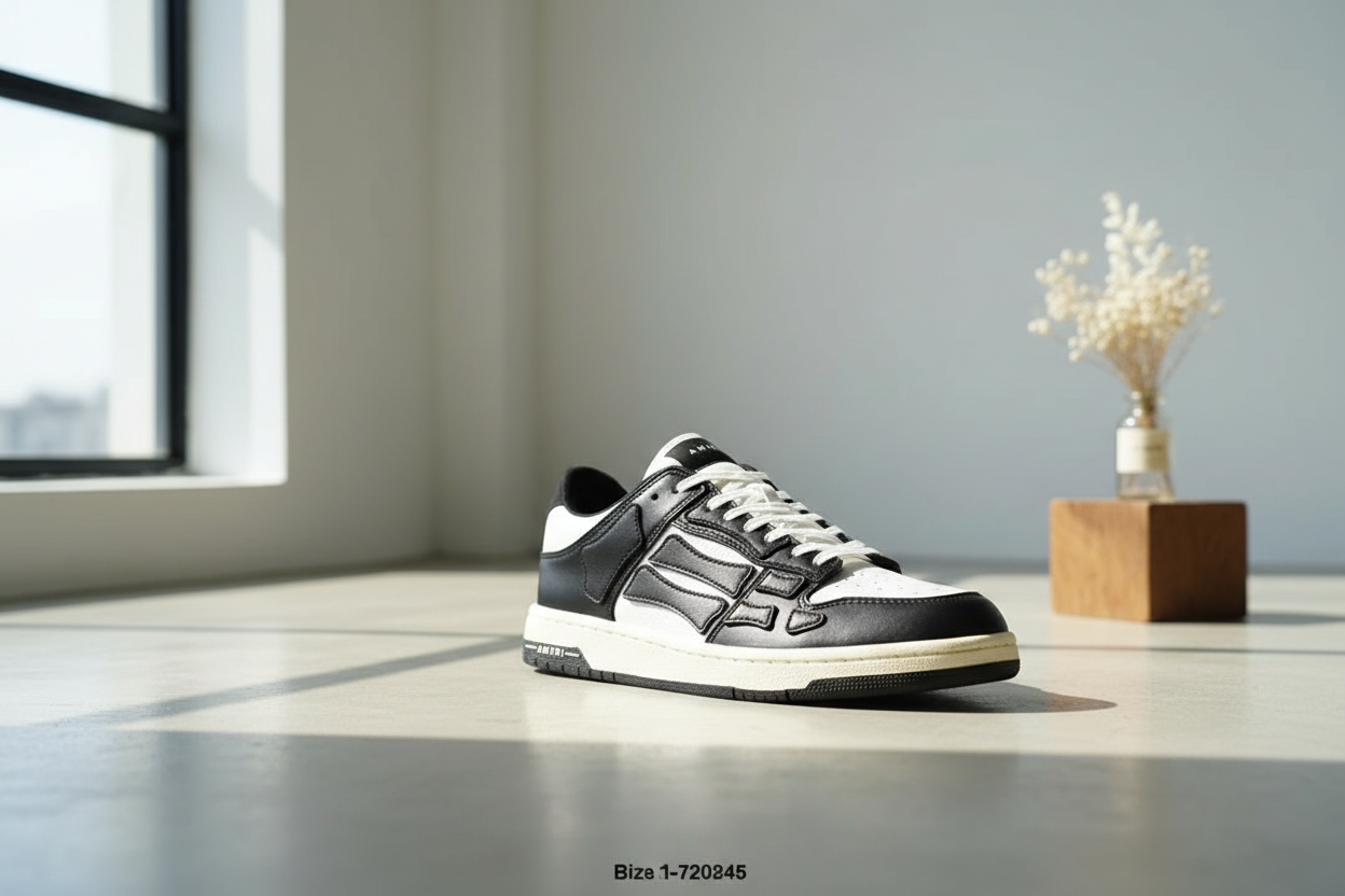 Amiri Bone Series Black White Sneakers, leather and suede mix, iconic bone pattern, unisex streetwear style, comfortable for daily wear, effortlessly stylish and versatile.
