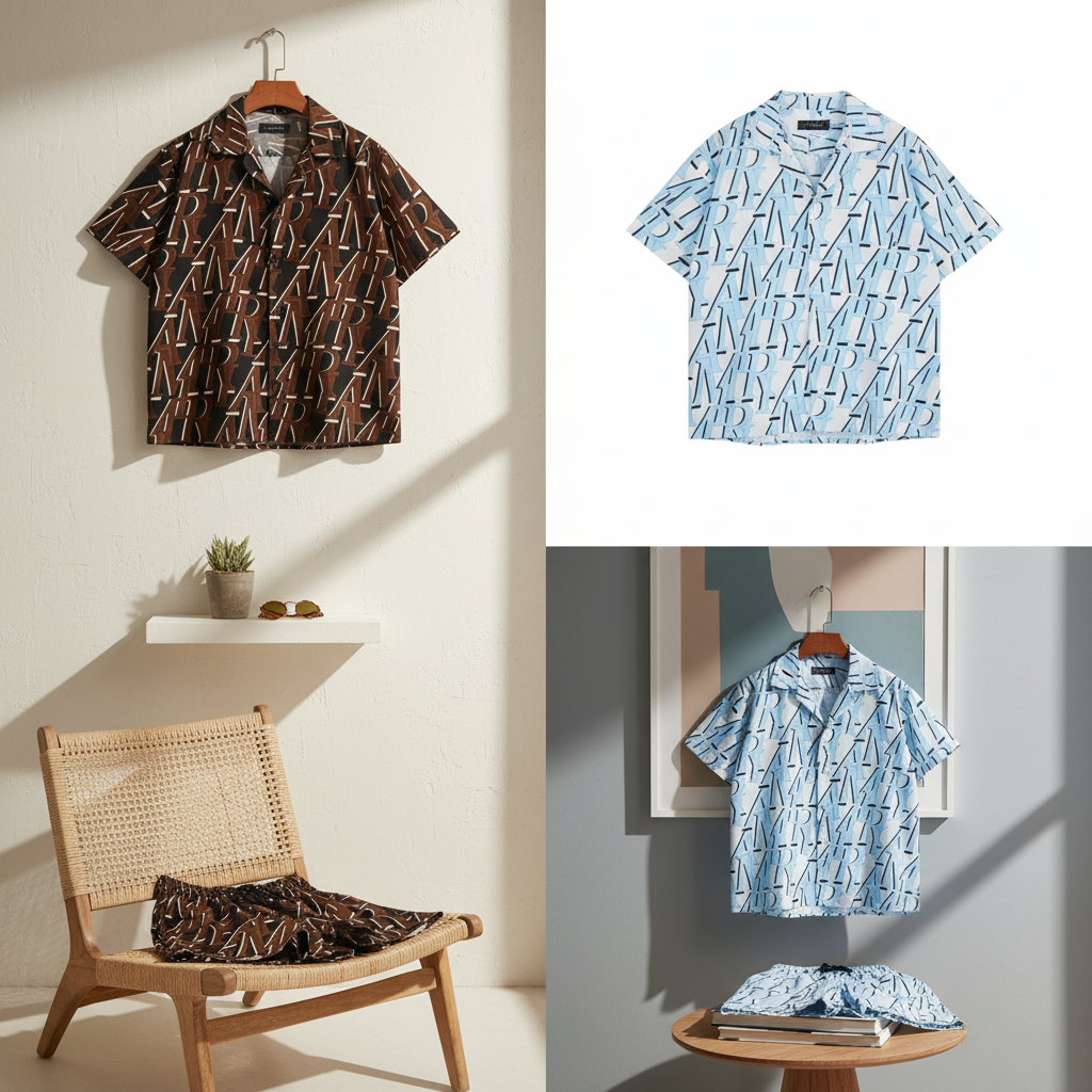 Amiri Brown Short Sleeve Shirt and Shorts Set, made of breathable fabric with all-over logo print, streetwear-inspired unisex design for stylish everyday comfort and casual fashion statement.