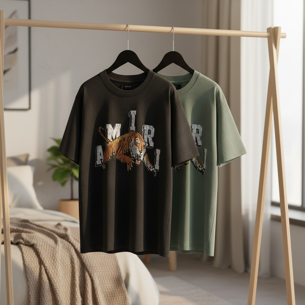 AMIRI Black Oversized T-Shirt crafted from premium cotton, soft and breathable. Features bold tiger totem and logo print, unisex streetwear style, perfect for daily casual outfits.