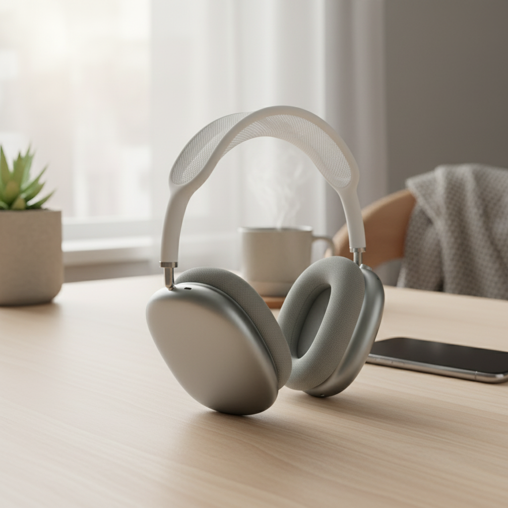 Apple Vision Pro AR Headset in mint green with metal frame and breathable fabric band, ergonomic fit, supports spatial computing and immersive interaction, futuristic style for men and women.
