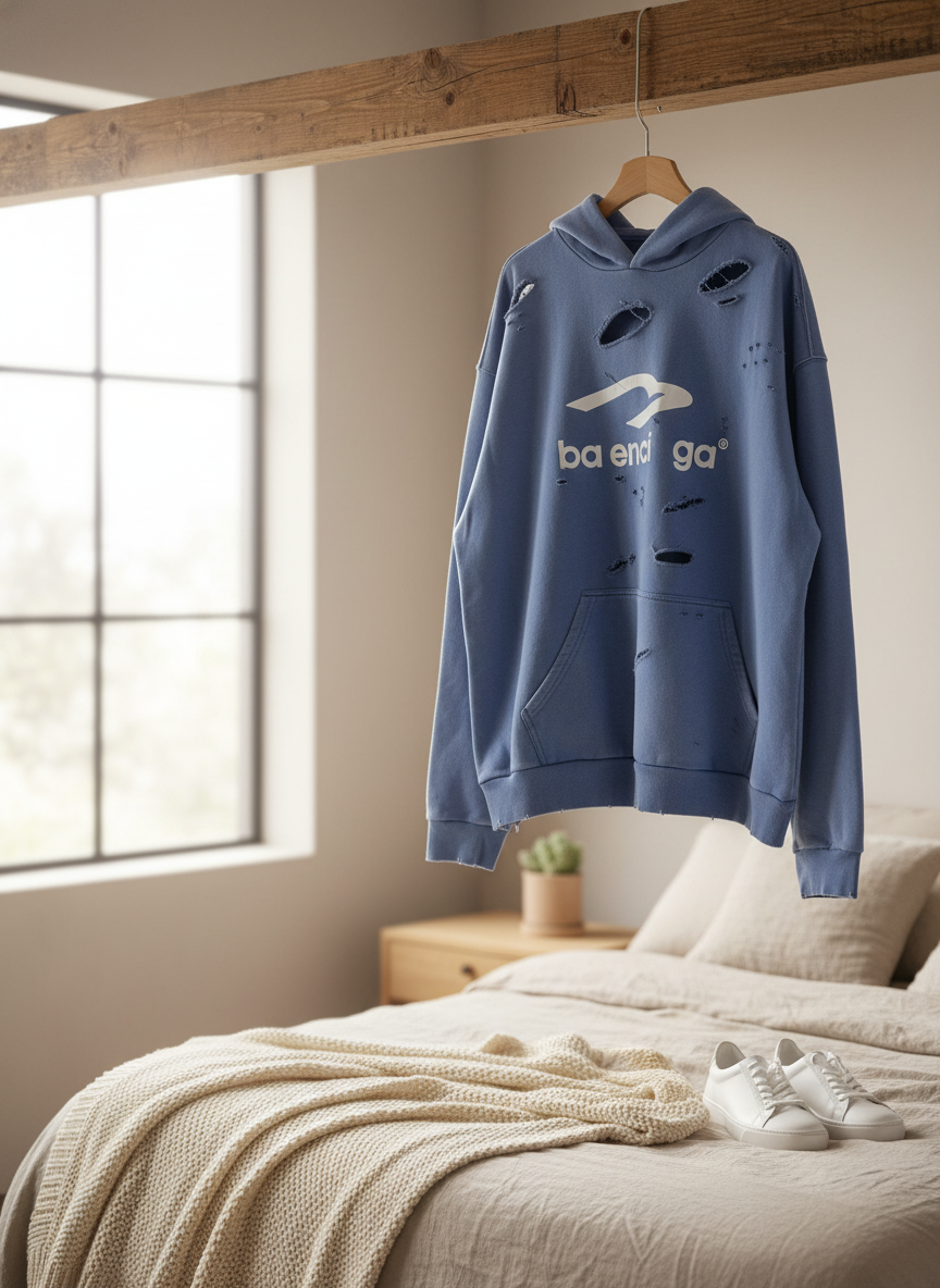 Balenciaga Blue Distressed Hoodie – Soft cotton fabric with ripped design, oversized fit, iconic white logo print, adjustable drawstring hood, front kangaroo pocket, unisex streetwear style.