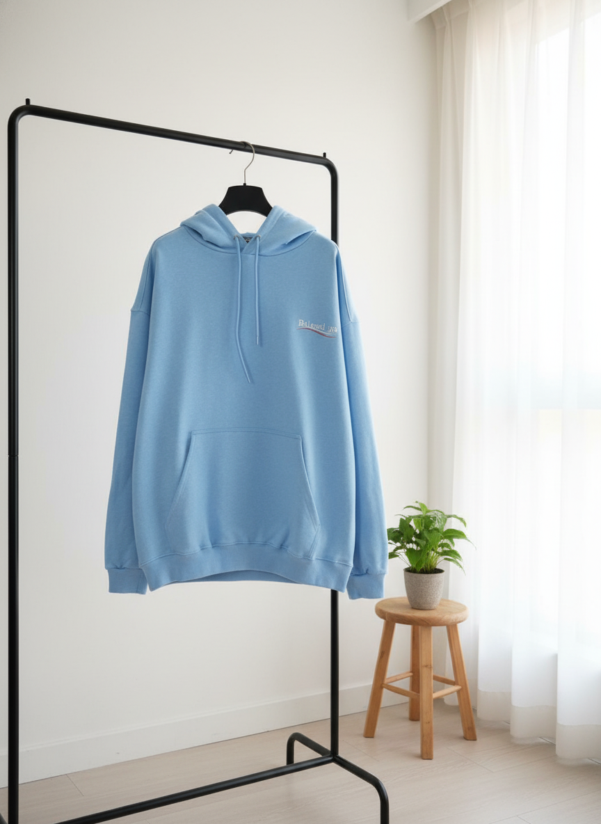 Balenciaga light blue cotton hoodie with drawstring hood, front kangaroo pocket, bold logo, unisex streetwear style, soft breathable fabric for casual fashion.