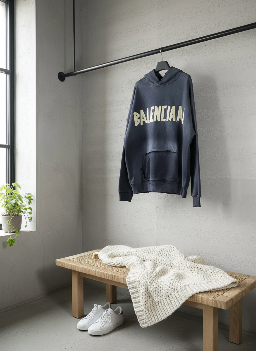 Balenciaga Dark Gray Distressed Cotton Hoodie with bold “BALENCIA AA” print, ripped kangaroo pocket design, unisex street style, comfortable fit, and high-end fashion appeal.