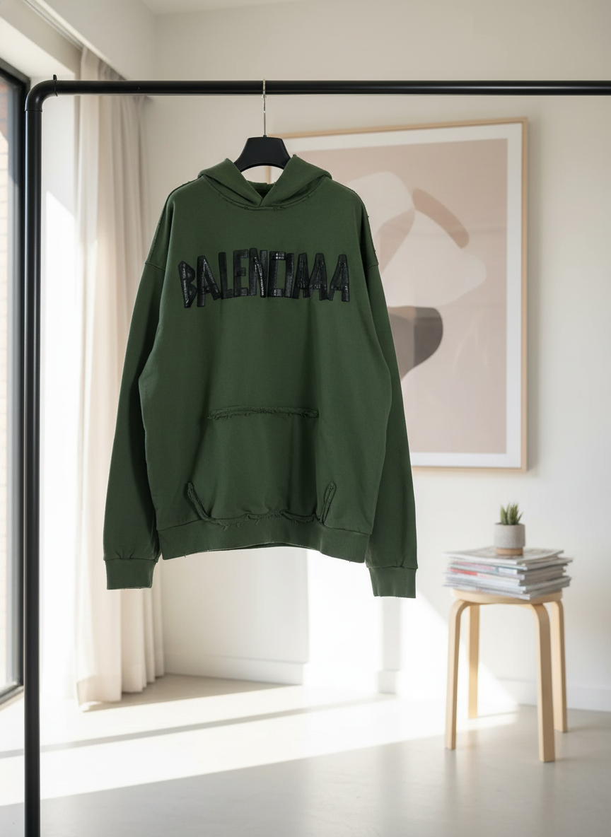 Balenciaga Olive Green Hoodie, soft cotton fabric with distressed holes and 3D letter detail, unisex streetwear style, perfect for casual daily looks with bold modern fashion vibes.