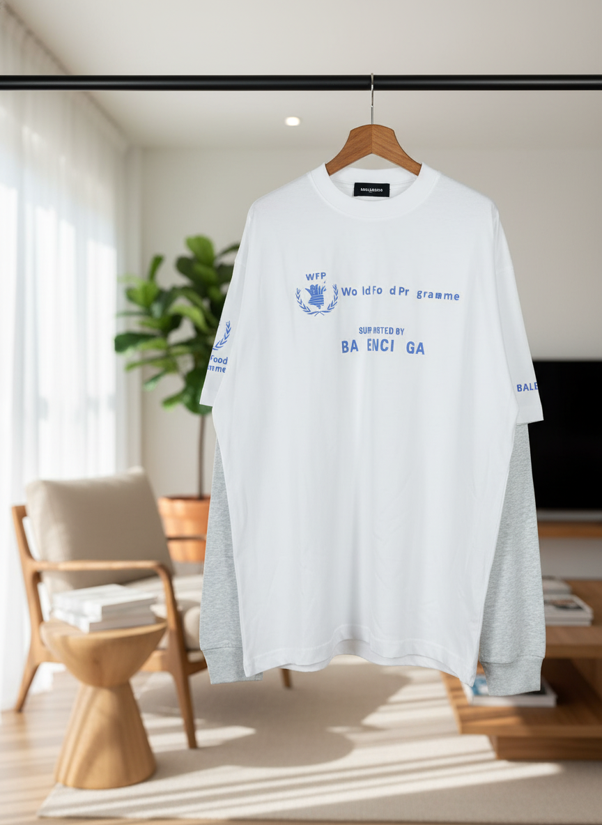 Balenciaga WFP white and gray layered long sleeve T-shirt, cotton fabric for breathable comfort, blue WFP logo, unisex streetwear style for casual and fashionable daily outfits.