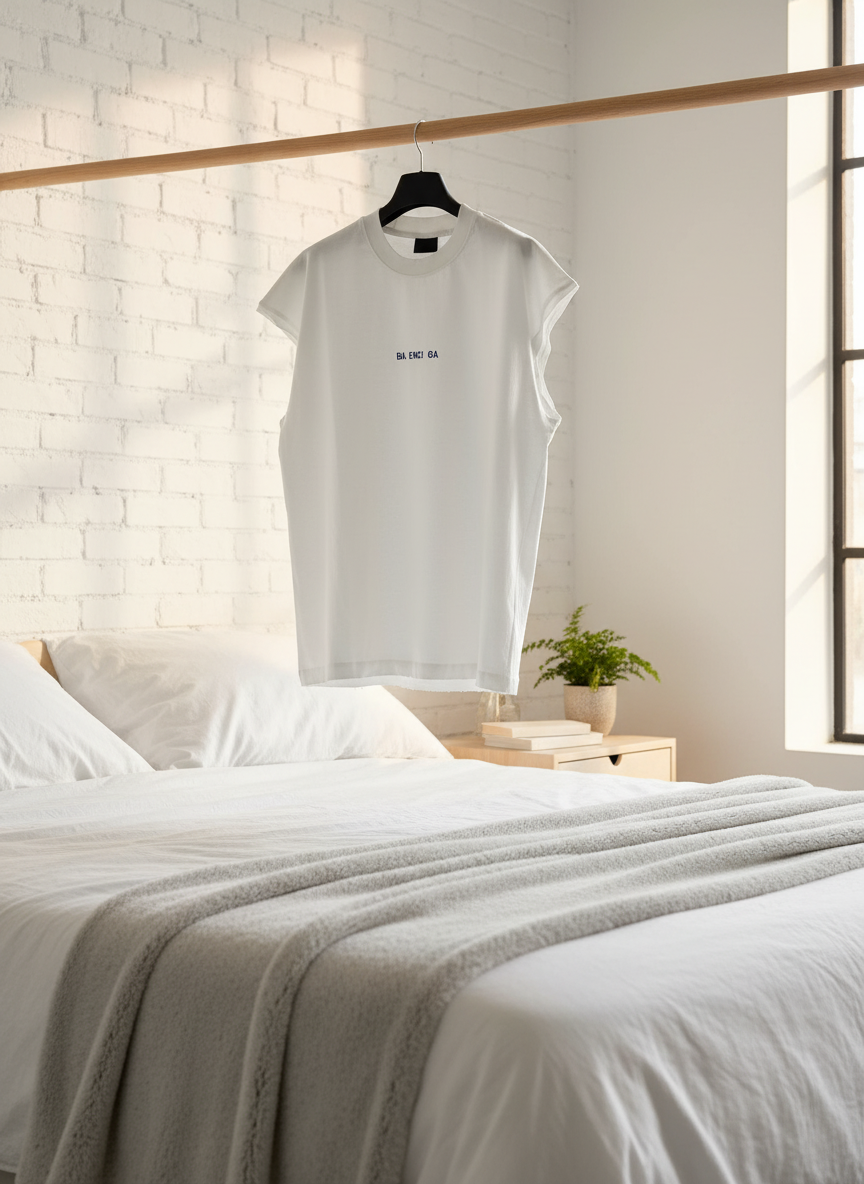 Balenciaga sleeveless white T-shirt crafted from soft premium cotton, featuring a crew neck, blue BA ENCI GA logo print, raw-edge hem, and a unisex minimalist casual style.