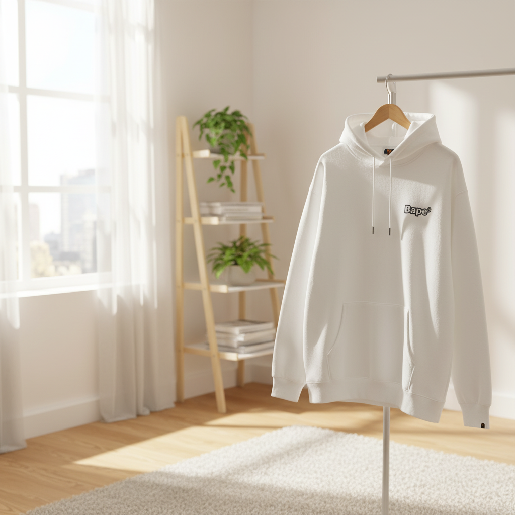 A Bathing Ape Bape white hoodie, soft breathable cotton, drawstring hood, front logo detail, graffiti back with ape motif, streetwear unisex design, practical kangaroo pocket, bold urban style.