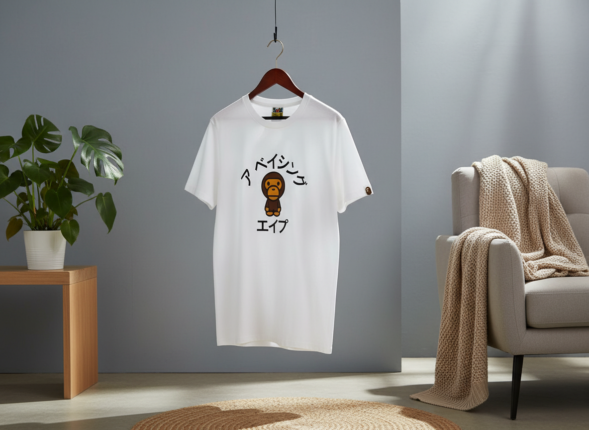 A Bathing Ape Classic White Cotton T-Shirt, soft and breathable, features iconic ape head graphic with Japanese text, sleeve brand tag, unisex streetwear style, perfect for trendy comfort.