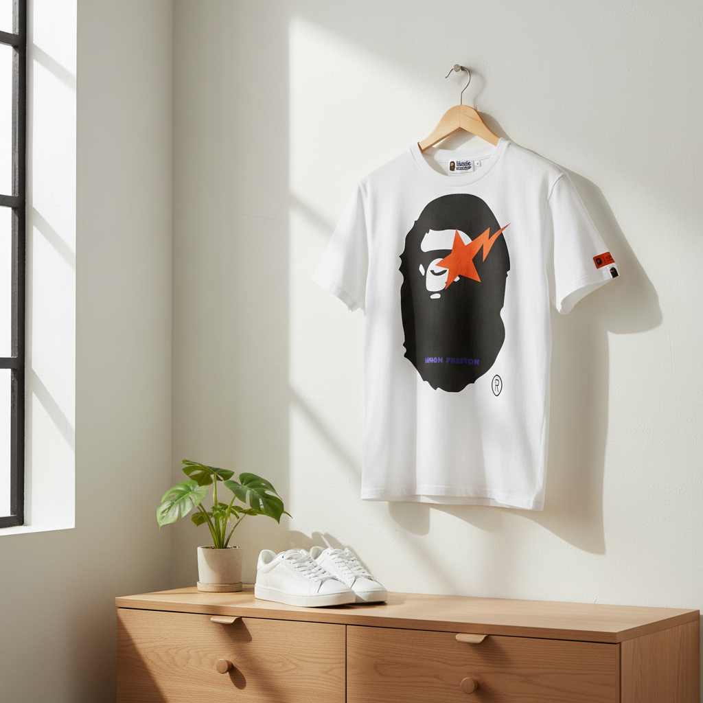 A Bathing Ape x Heron Preston white T-shirt, soft breathable cotton, features iconic black ape head with orange lightning star and purple logo. Unisex streetwear style for casual fashion.
