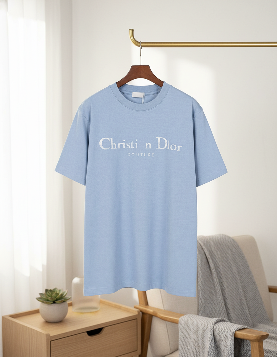 Dior Classic Light Blue T-Shirt, made from premium cotton for softness and breathability. Features a relaxed fit, crew neck, and white “Christian Dior COUTURE” logo. Unisex, stylish and elegant for casual wear.
