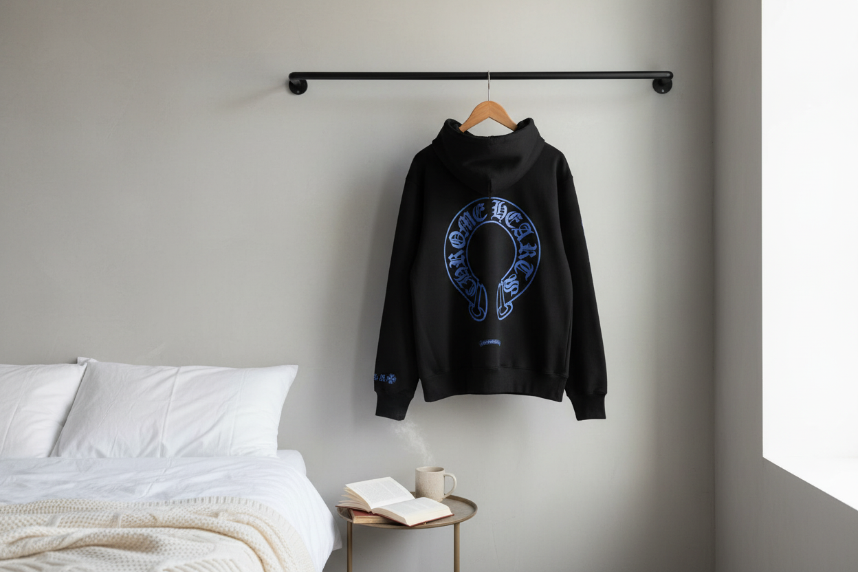 Chrome Hearts Black Hoodie – crafted from premium soft cotton, featuring signature blue horseshoe print on the back, classic hood design, unisex streetwear style, warm and stylish for everyday wear.