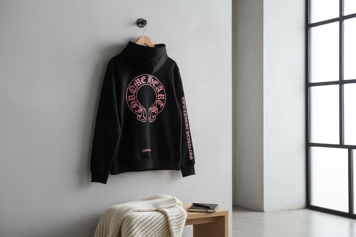 Chrome Hearts black cotton hoodie featuring a pink horseshoe logo and gothic lettering on the back, soft breathable fabric, unisex streetwear style for comfort and individuality.