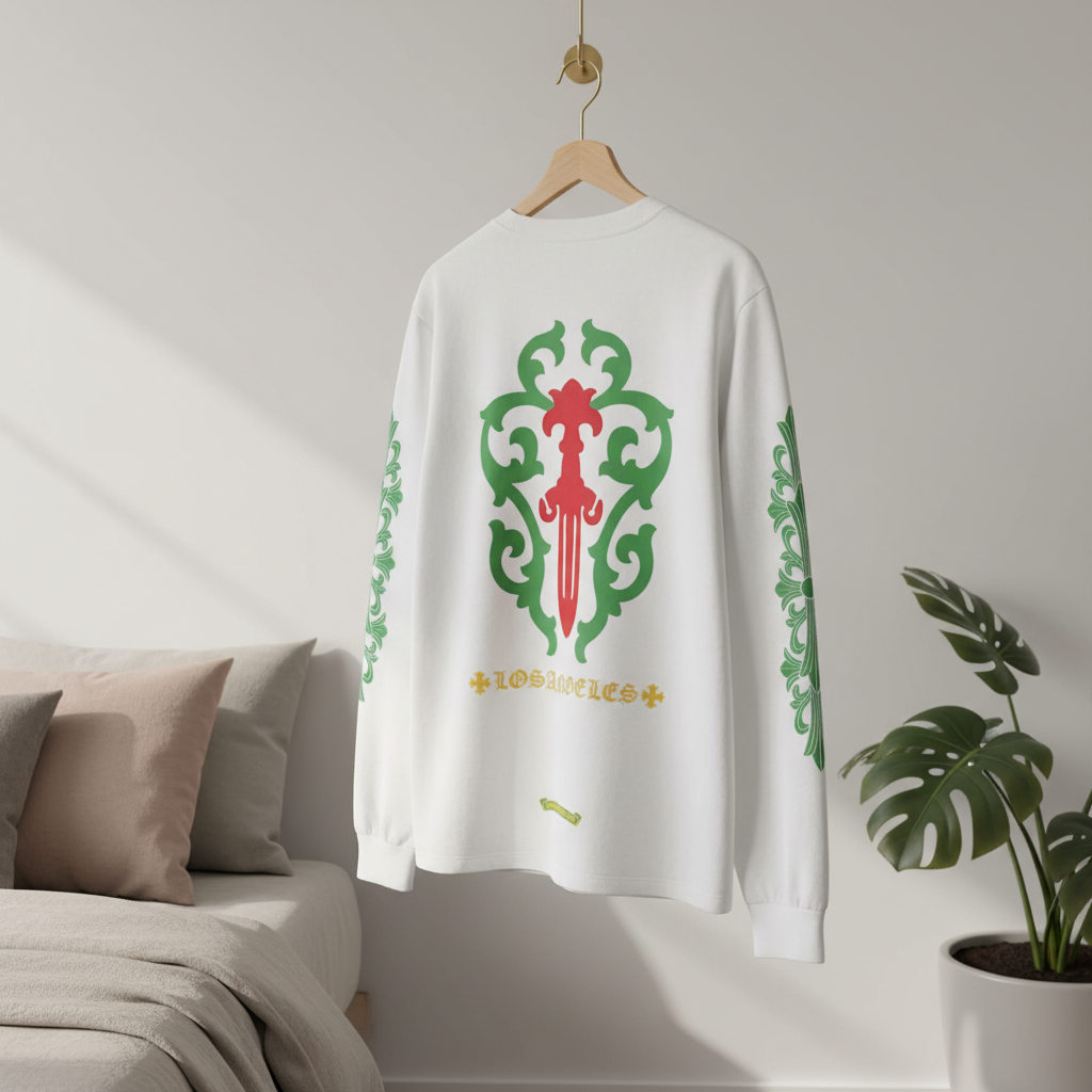 Chrome Hearts Los Angeles Series White Long Sleeve T-Shirt, premium cotton, red-green totem back, sleeve patterns, street fashion unisex style, comfy and unique for daily wear.