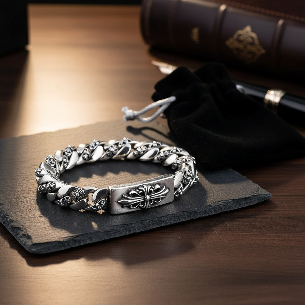 Chrome Heart Classic Cross Cuban Link Bracelet, silver metal, dark punk style, unisex design with iconic cross motif, trendy accessory for bold fashion and daily streetwear style.