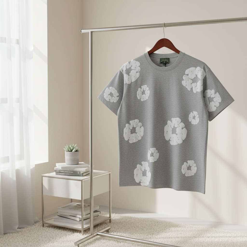 DenimTears Grey Cotton T-Shirt with White Floral Print, breathable and soft, unisex street style tee for daily wear, effortlessly expressing personality and modern fashion attitude.
