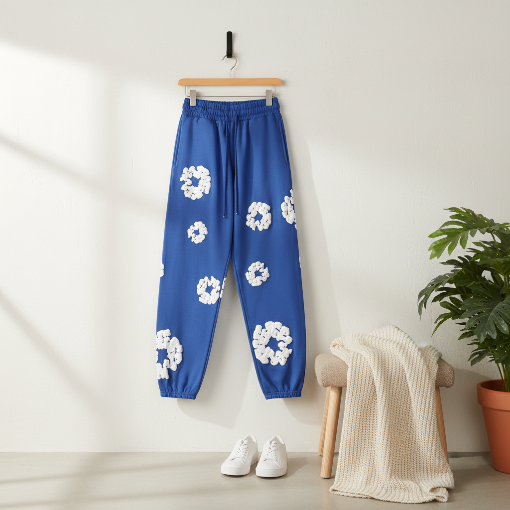 DenimTears Blue Jogger Pants, soft cotton-blend fabric, drawstring waist and cuffs, 3D white flower patterns, streetwear style, unisex design for a trendy, casual look.