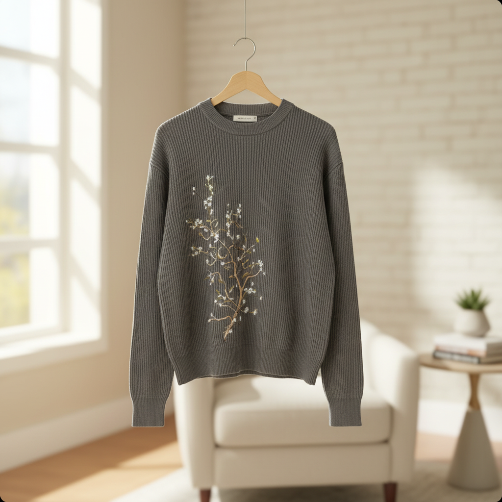 Derschutze Gray Artistic Knit Sweater, soft fabric with delicate floral branch embroidery on the back, round neck, long sleeves, warm, comfortable, unisex, casual and elegantly unique style.