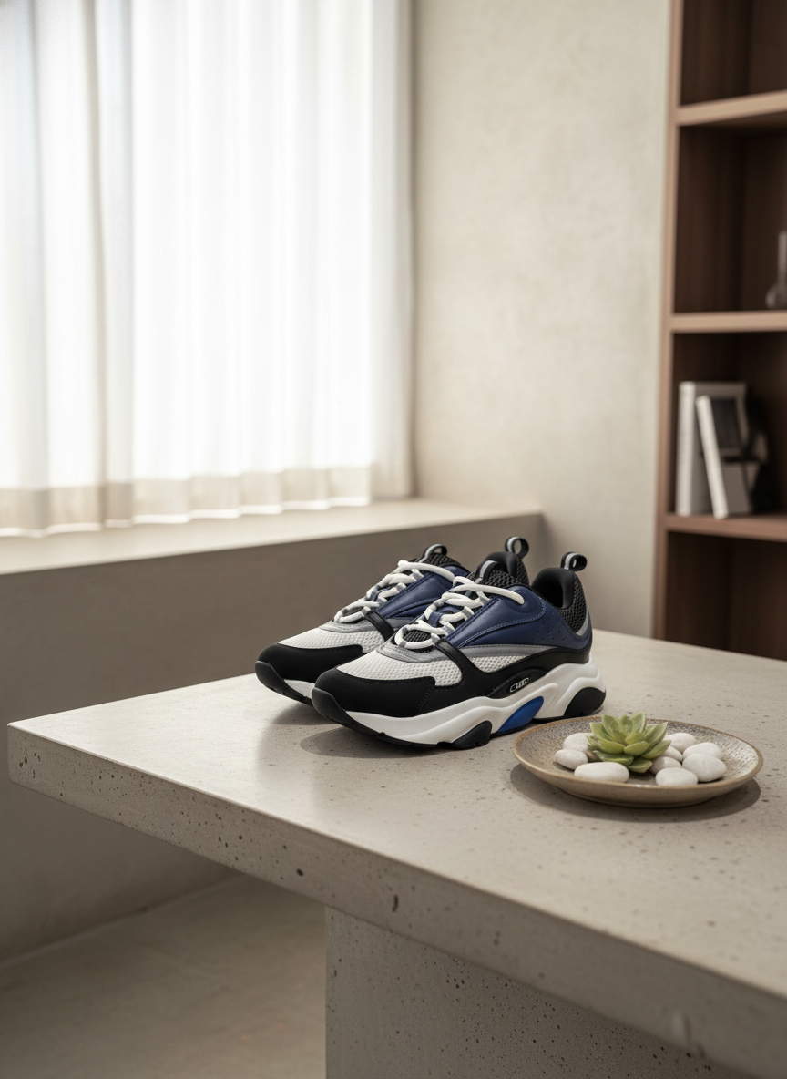Dior Fashion Sneaker Series: Black, white, blue, and gray mesh and synthetic leather shoes with chunky sole, breathable and stylish, unisex design for casual wear and light sports.