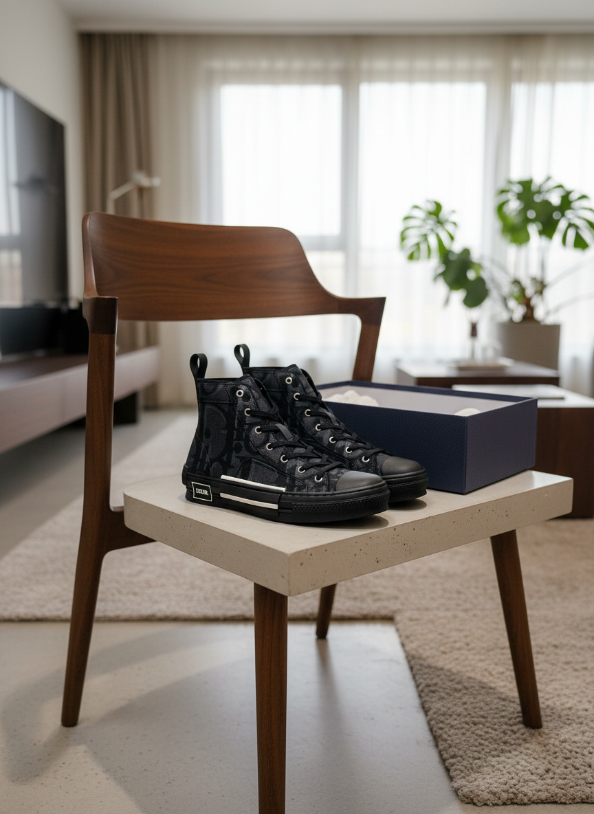 Dior Black High-Top Canvas Sneakers featuring iconic logo pattern, trendy unisex design, comfortable fit, and versatile style perfect for daily casual wear and modern street fashion.