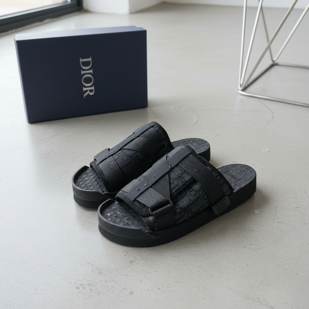 Dior Black Casual Series Slides feature fabric and nylon straps with adjustable Velcro, offering breathable comfort, modern minimalist style, and unisex design for everyday wear.