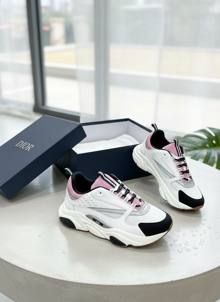 Dior B30 Sneakers in white, black and pink, mesh breathable design with thick sole, trendy dad shoe style, unisex, featuring Dior metal logo on side, stylish, comfortable and versatile.