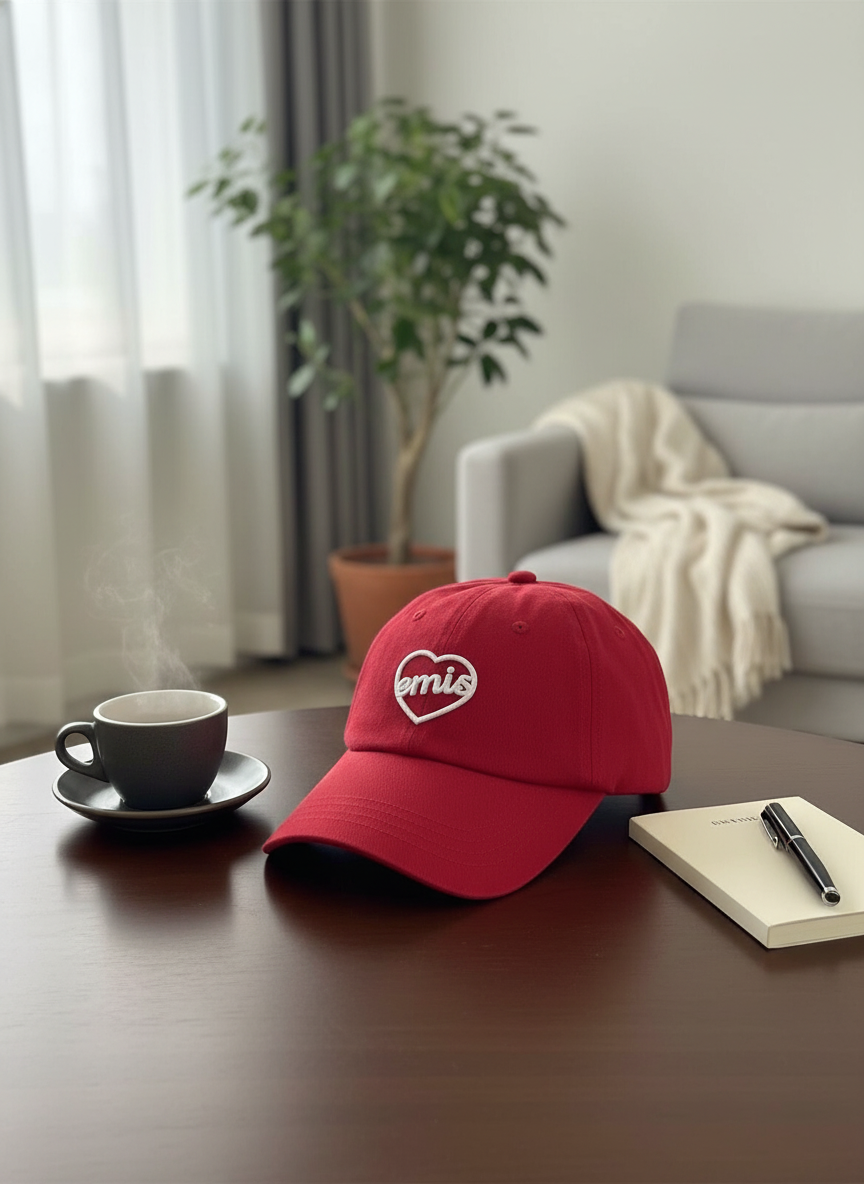 Emis Red Cotton Baseball Cap with White Heart Logo, unisex casual style, sun protection, comfy, versatile for daily wear, adds trendy touch and personal flair.