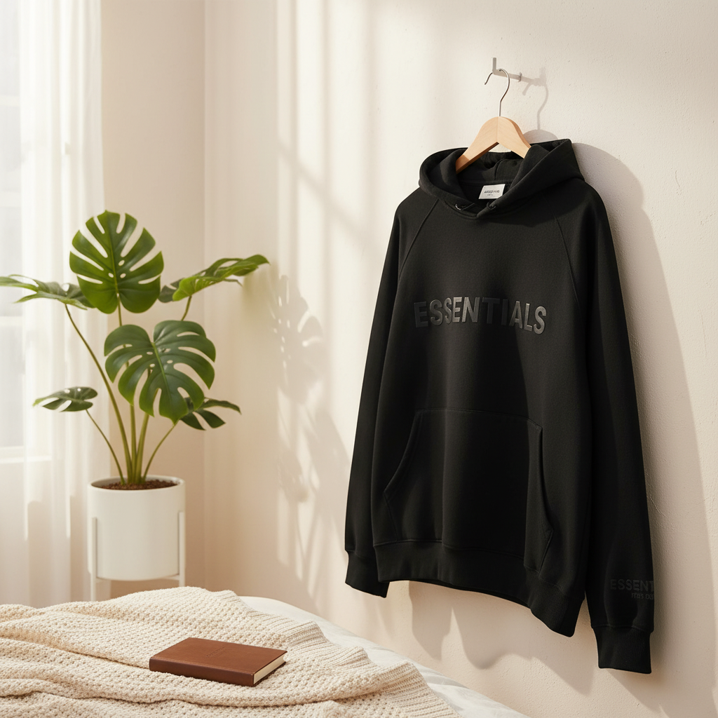 Essentials black hoodie made from premium soft breathable cotton, featuring logo print, classic drawstring hood and front pocket. Unisex street style for daily comfort and modern fashion.