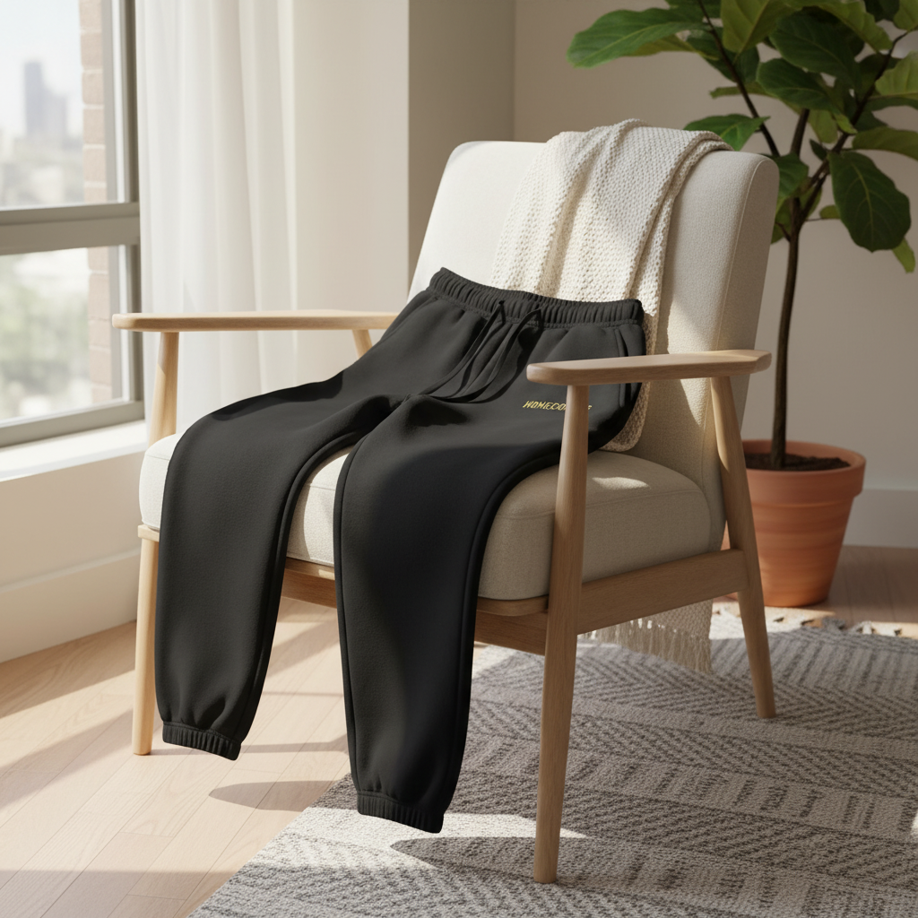 Essentials Black Sweatpants – soft cotton fabric, gold HOMECOMING print on the side, adjustable drawstring waist, tapered cuffs, unisex design for comfort and trendy streetwear style.