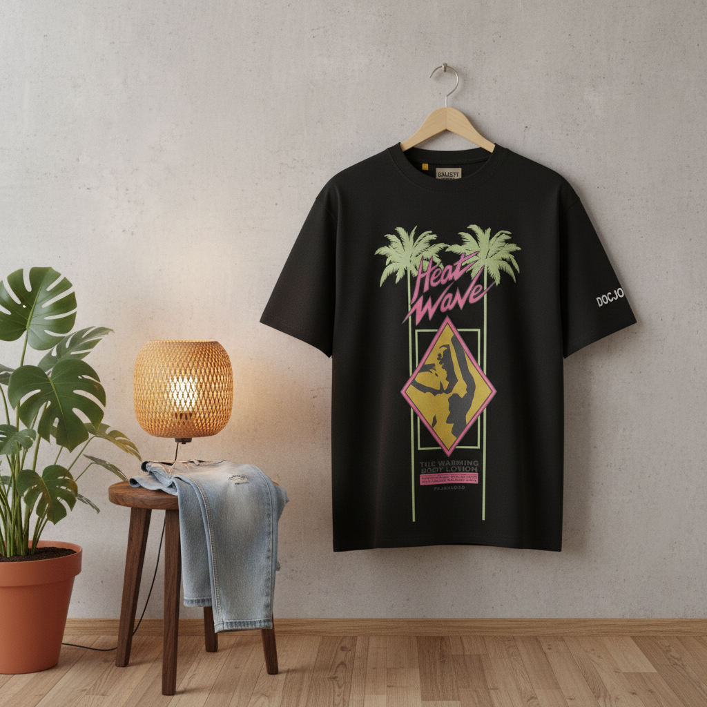 Gallery Dept Heat Wave black cotton T-shirt with palm tree and diamond graphic, DOCJOY sleeve logo, retro unisex streetwear style, perfect for casual everyday wear.