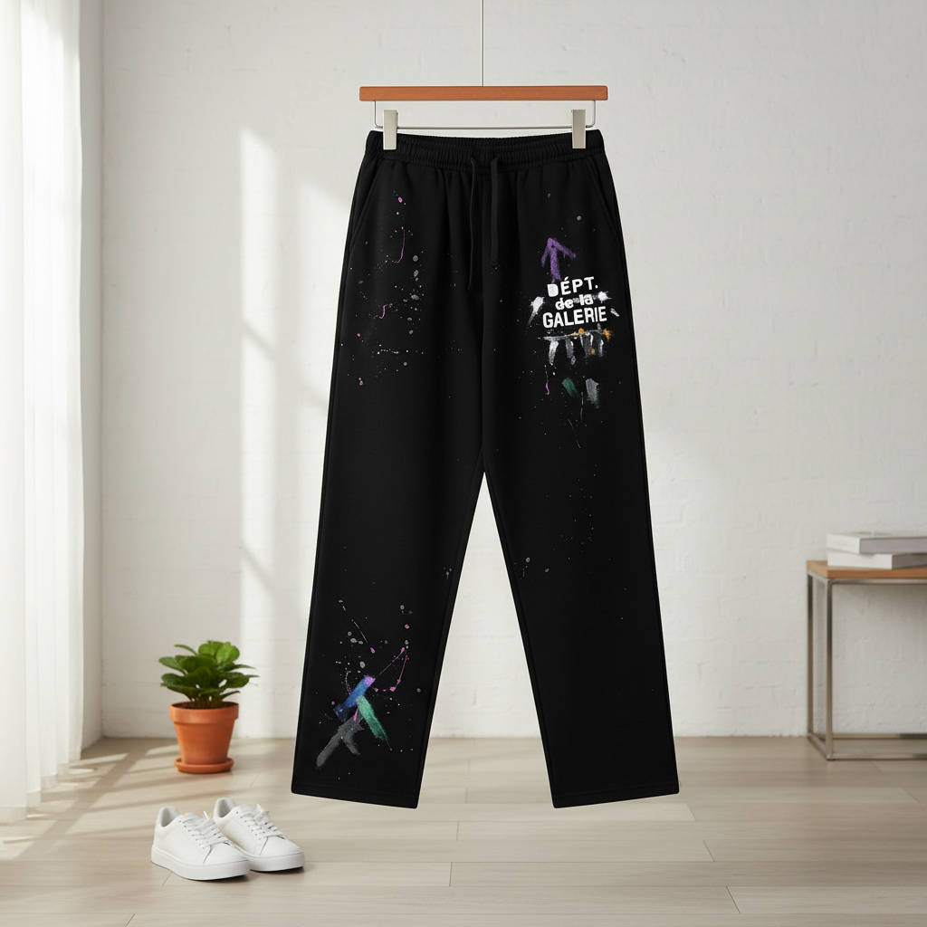 Gallery Dept black casual pants crafted from premium soft cotton, featuring adjustable drawstring waist, paint-splatter graffiti logo design, unisex streetwear style for daily fashion looks.