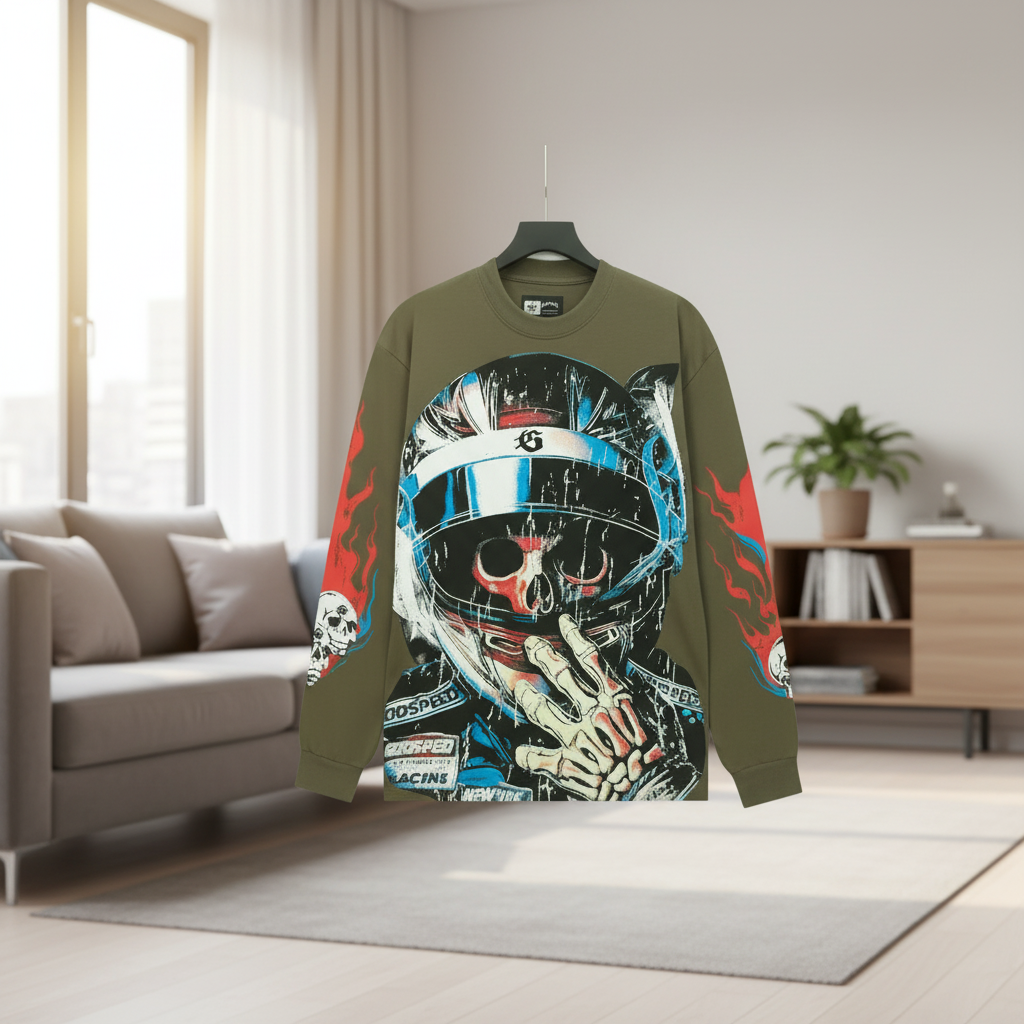 GOD SPEED Olive Green Street Style Long Sleeve T-Shirt, soft breathable cotton, bold skull racer front print and trophy back design, unisex casual wear for daily outfit and urban fashion.