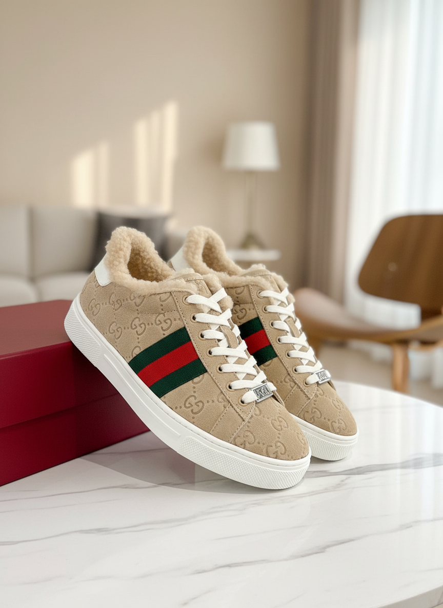 Gucci Classic Beige Suede Fur-Lined Sneakers with GG Monogram and Red-Green Stripe, Unisex Warm Casual Shoes, Luxury Comfort and Timeless Style for Trendy Everyday Wear.
