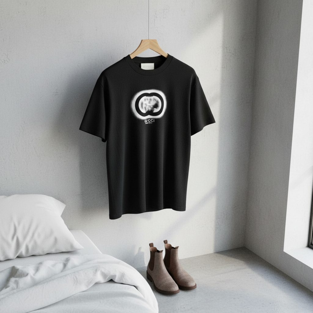 Gucci black short sleeve T-shirt made of premium soft cotton, featuring iconic Double G logo print and “GUCCI MADE IN ITALY”, classic crew neck, unisex style, perfect for daily casual luxury fashion.