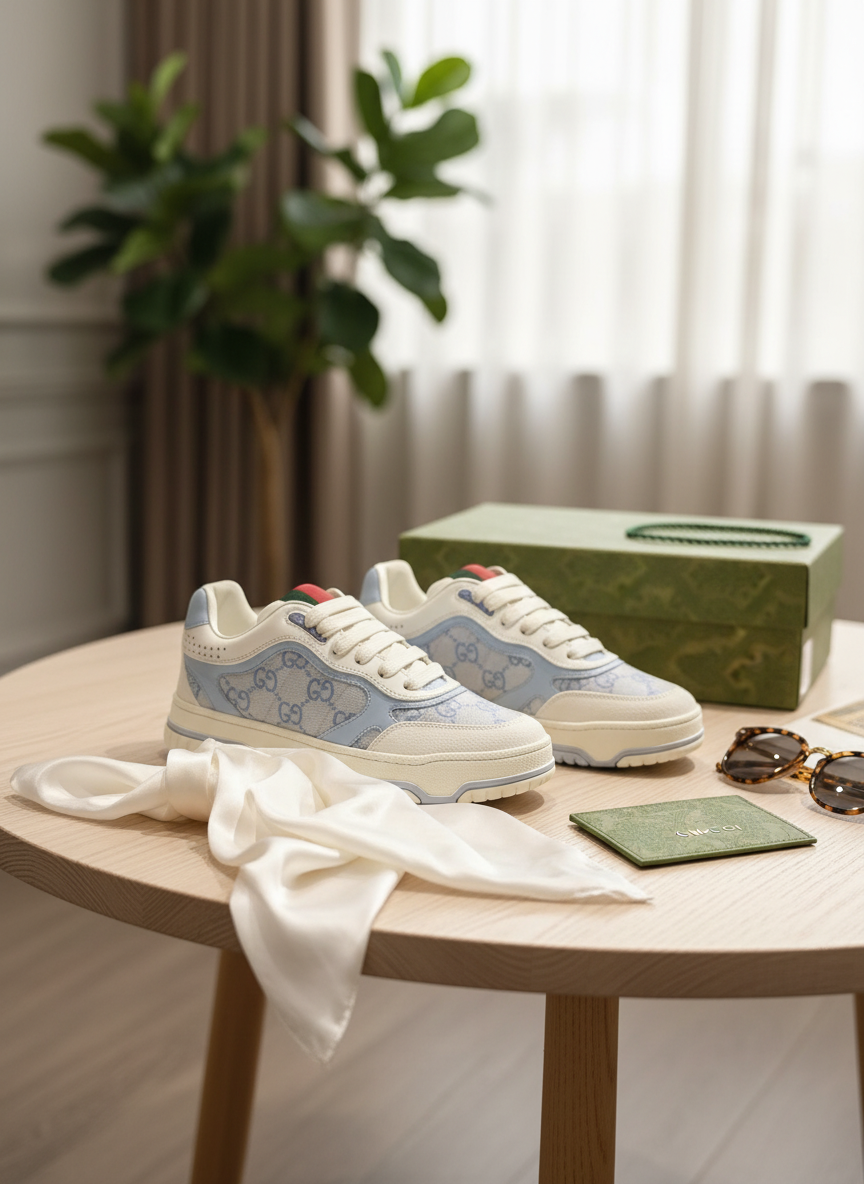 Gucci Blue White Sneakers, mesh and leather mix with iconic GG motif and red-green stripe, breathable comfort, unisex design, stylish casual shoes perfect for everyday wear.