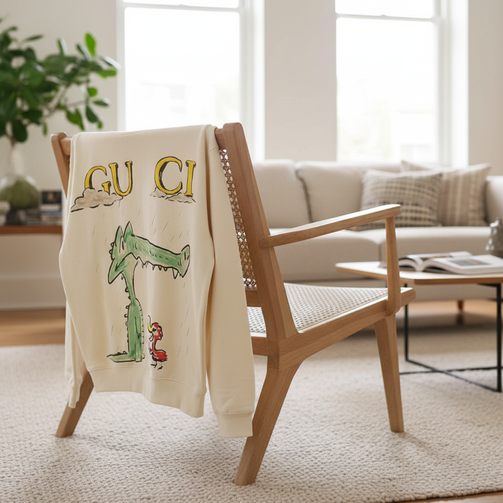 Gucci Off-White Cotton Sweatshirt featuring playful cartoon crocodile and bird print with GU CI letters, soft and comfy unisex design for casual wear and stylish everyday fashion.