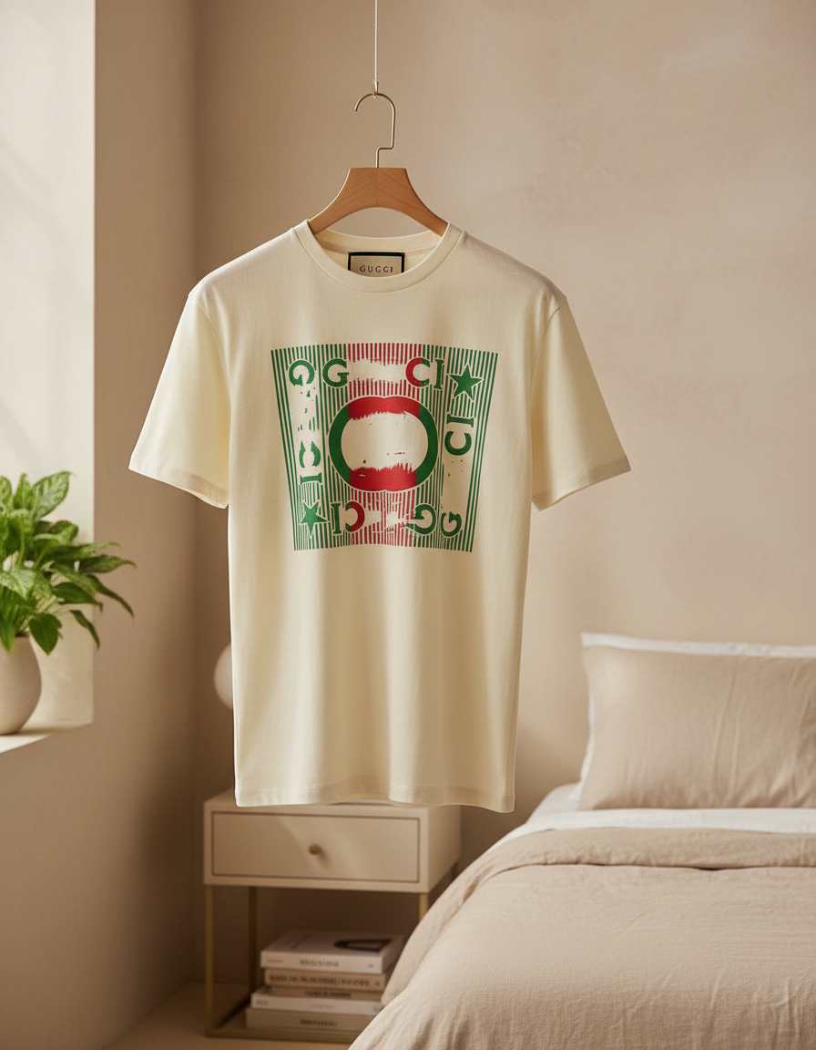 Gucci off-white cotton T-shirt featuring red and green Gucci lettering with star print, vintage-inspired unisex style, soft and breathable for daily casual wear, showcasing Gucci’s signature design flair.