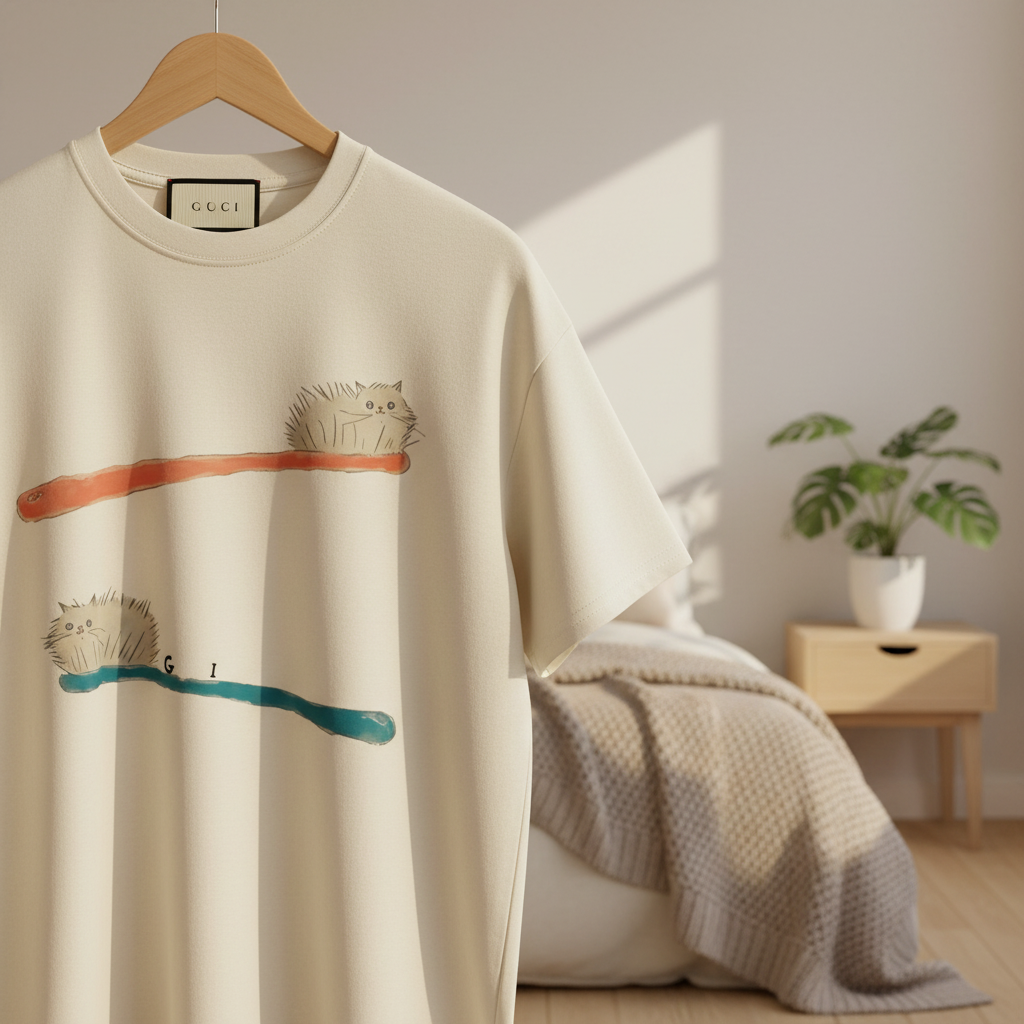 Gucci Off-White Cotton T-Shirt with Fun Cat and Toothbrush Print, Unisex Casual Style, Soft Breathable Fabric, Perfect for Daily Wear, Show Your Unique Trend and Personality.