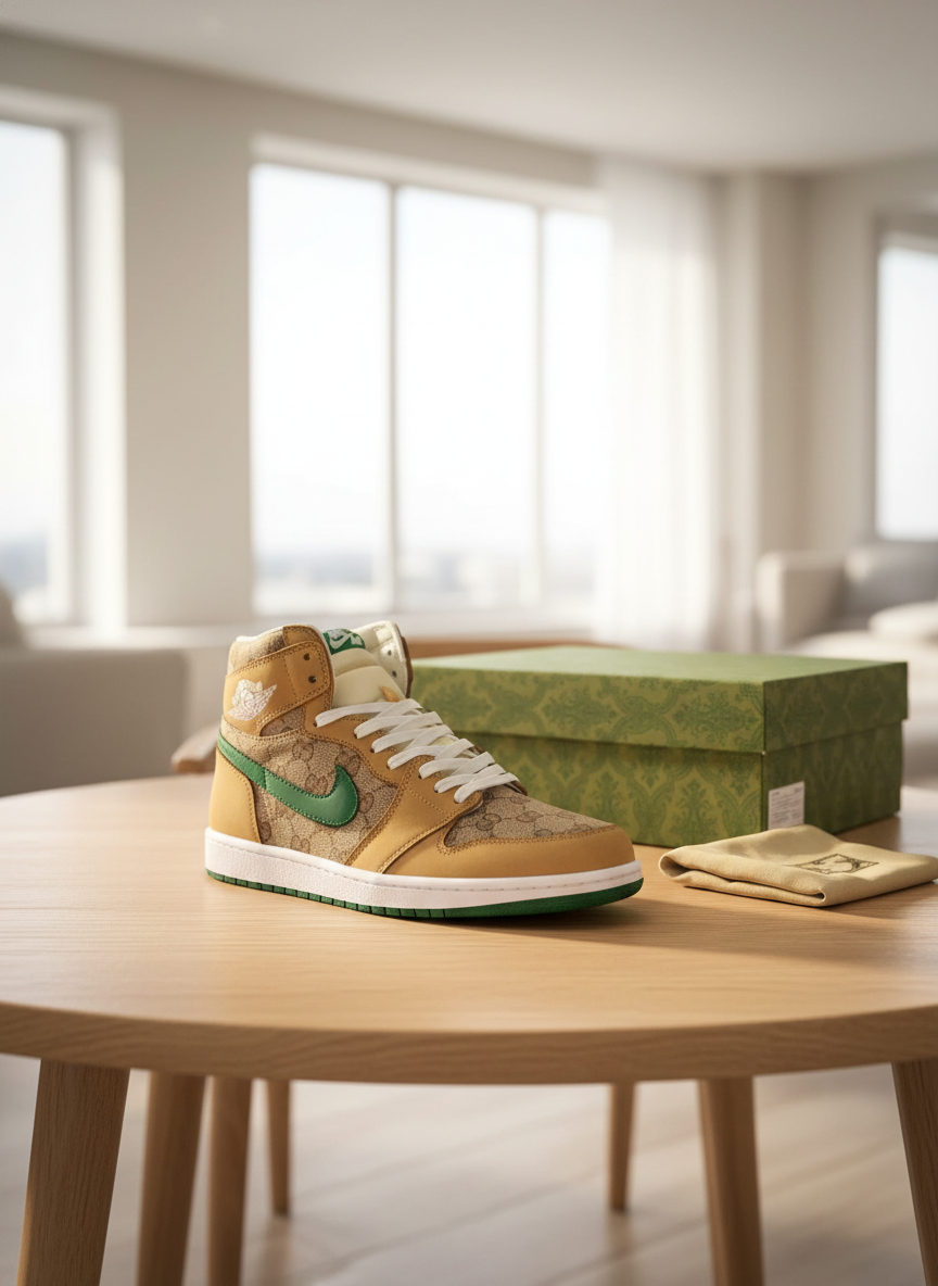 Gucci x Collaboration Brown Yellow High-Top Sneakers, crafted from monogram canvas and suede, featuring green logo detail and classic double G motif, unisex design perfect for casual everyday style.