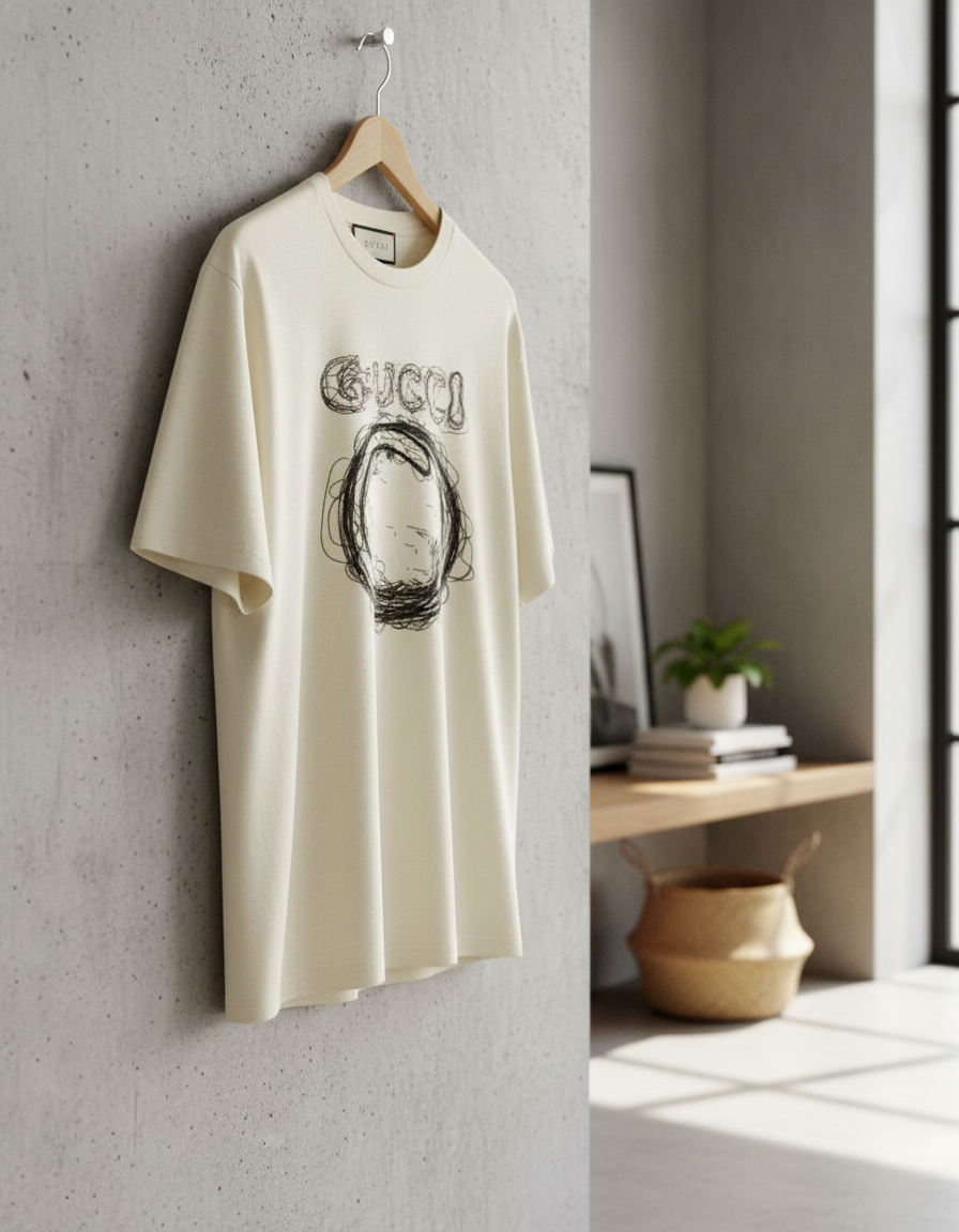 Home / T-Shirts/ Gucci Scribble Logo Beige Cotton T-Shirt